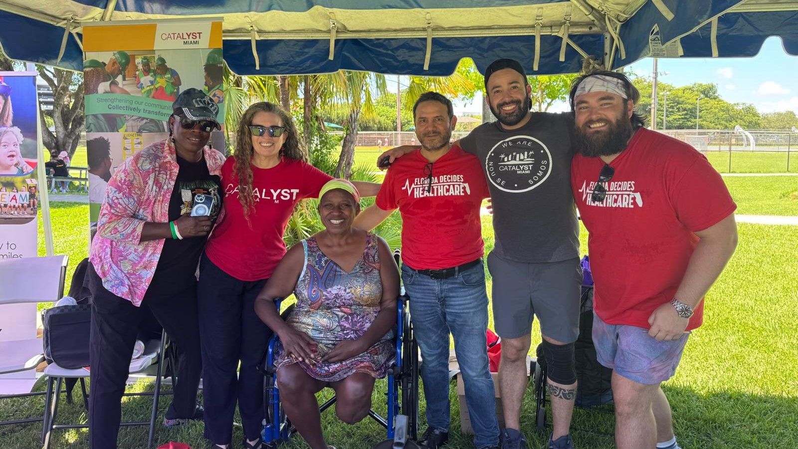 Tracey Bowen (center) surrounded by Catalyst Miami staff and community members at a Florida Decides Healthcare tabling event.